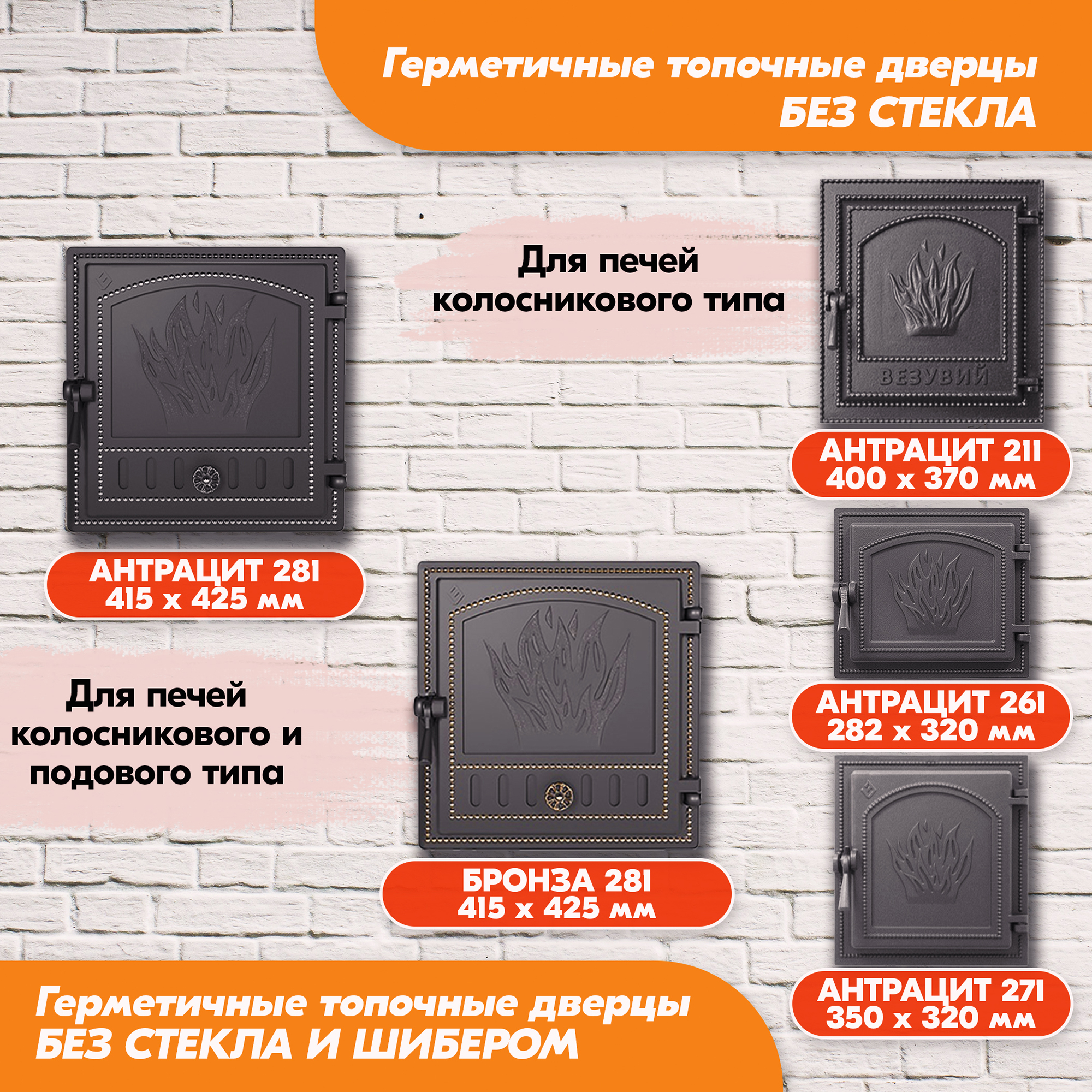 Наружный размер и посадочный размер для каждой печной дверки указан на изображениях в каждой карточке.