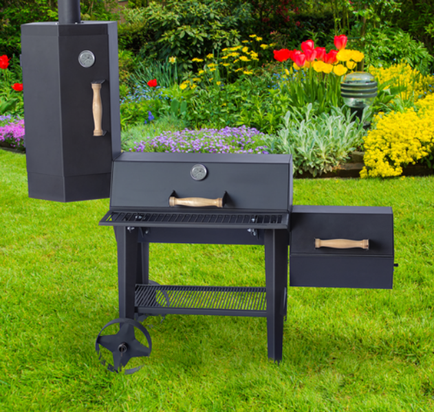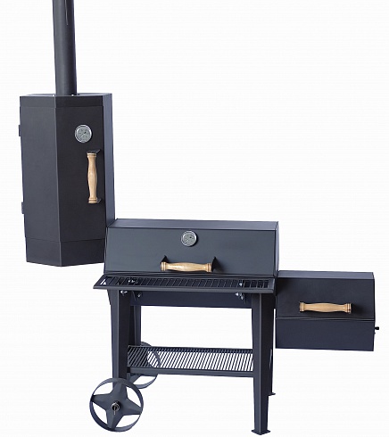 Конструкция сочетает в себе барбекю, гиль, коптильни холодного и горячего копчения. Фактически — 4 в 1. Внешне выглядит как усовершенствованное классическое барбекю.